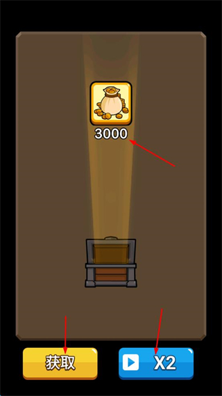 2、戰斗勝利后,出現寶箱界面,可直接獲取3000金幣,或者通過看廣告可以讓翻倍獎勵,積累資源升級。