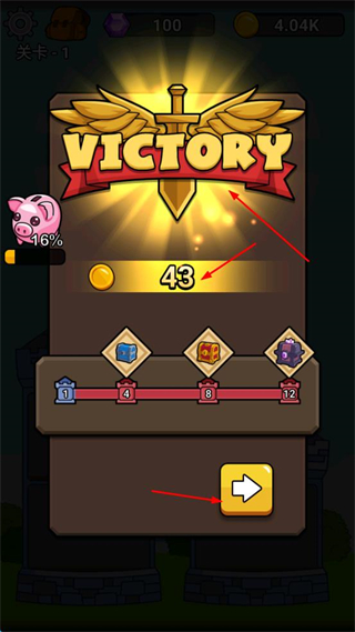 4、通關后顯示VICTORY,可以免費領取金幣等獎勵,點擊箭頭推進下一關,提升城堡與士兵戰力。