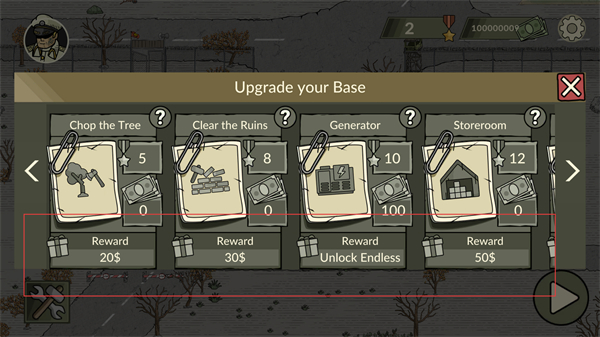 2、在基地升級界面選擇對應選項,完成如砍伐樹木等操作,獲取對應的金錢獎勵。