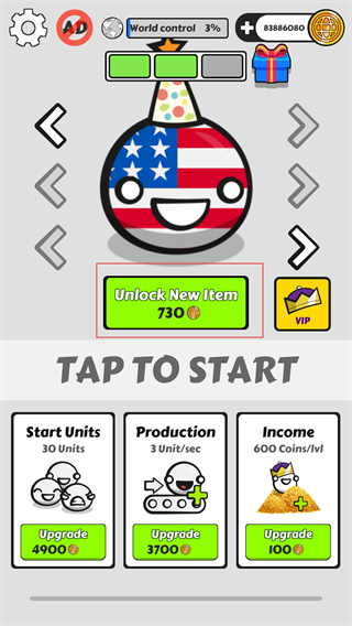 1、點擊UnlockNewItem按鈕,消耗對應的貨幣解鎖新物品,為后續的國家發展獲取更多資源。