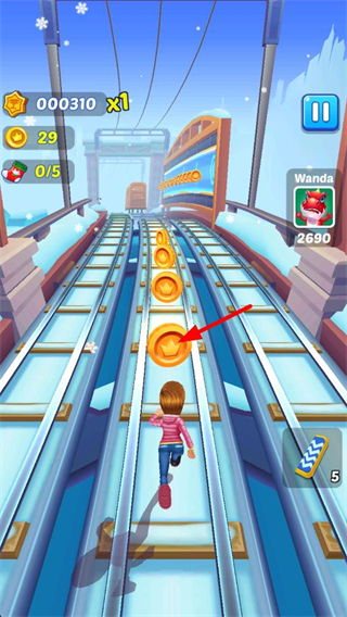 1、操控角色在軌道上奔跑,收集沿途的金幣,同時避開軌道上的障礙物,不斷前進積累得分。