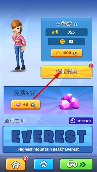 3、一局結束后會出現得分界面,顯示當前得分和金幣數量,點擊領取獎勵按鈕,即可獲取本局對應的獎勵。