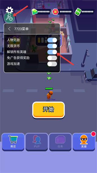 1、界面左上角有鑰匙形狀的設置相關入口,點擊后可打開功能菜單,開啟解鎖所有英雄開關即可直接解鎖游戲內的所有人物。
