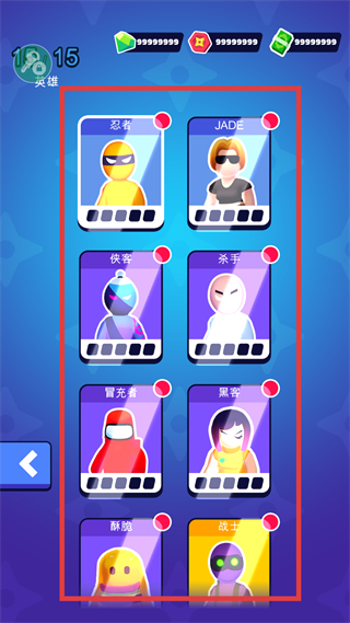 3、進入英雄界面后會展示出所有已解鎖的人物列表,每個角色都有對應的展示卡片,可在列表中瀏覽所有人物,根據喜好選擇想要使用的角色。