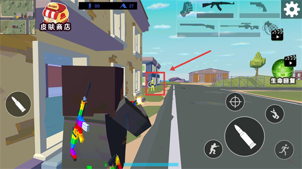 4、發現敵方目標后,先利用建筑遮擋物側身瞄準,點擊射擊按鈕攻擊敵人,同時觀察敵方動向,若敵方反擊則快速退回掩體,調整位置后再繼續輸出。