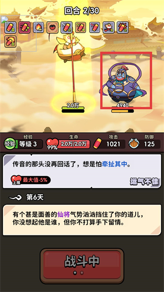 2、進入第6天的戰斗后,敵方單位血量會提升,戰斗中角色生命會小幅下降,需依靠已解鎖的技能提升作戰效率。