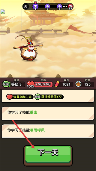 1、點擊【下一天】繼續推進,后續事件還會帶來屬性恢復、經驗等增益,助力角色成長。