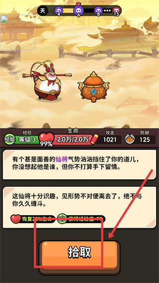 3、部分戰斗勝利后,敵方會主動撤離,同時會掉落道具,點擊【拾取】按鈕可獲取該道具。