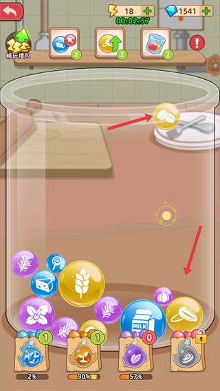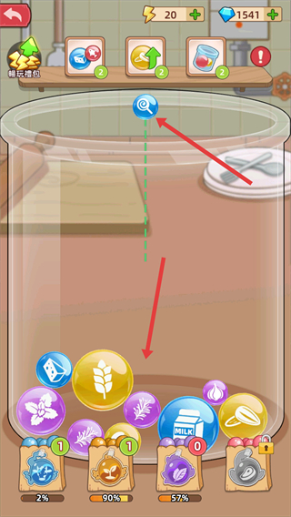 2、在小游戲場景中觀察上方出現的元素球,調整其下落位置,使其與容器內相同的元素球接觸,觸發合成。