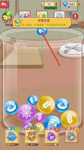 3、持續調整新元素球的下落位置,與已有元素球完成合成,積累合成進度,推進對應的任務要求。