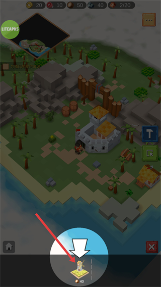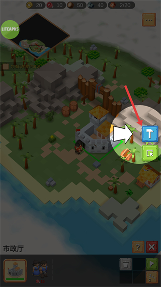 1、界面中可看到建筑與資源分布,點擊帶箭頭的建筑區域,可觸發對應操作,同時注意右側的錘子按鈕,后續可通過這些按鈕管理建筑、推進發展。