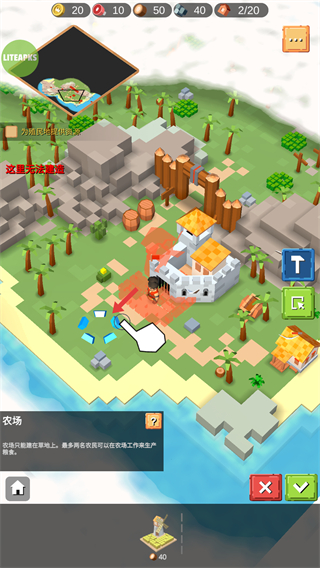 3、操作后界面會顯示【這里是農場】的提示,同時建筑區域按著箭頭移動至指定區域,才能進行建造。