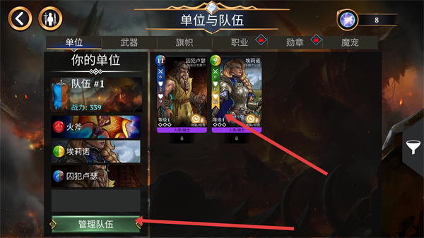 3、在單位與隊伍界面可查看當前隊伍的戰力及成員,點擊管理隊伍可調整單位配置也能切換旗幟職業等標簽頁,優化隊伍組合以適配不同戰斗需求。