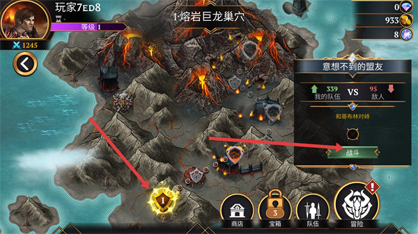 2、地圖界面可查看當前關卡為熔巖巨龍巢穴,點擊關卡標識可進入戰斗右側顯示對戰雙方戰力,點擊戰斗按鈕即可開啟挑戰。