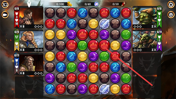 4、進入消除戰斗界面左側顯示己方單位右側為敵方,通過消除對應顏色的圖標可觸發技能消除越多能積累更強戰力,需策略搭配消除順序以擊敗敵方單位。