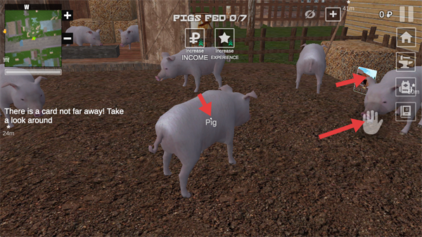 3、進入養豬場景,根據提示尋找附近卡片,點擊界面右側的操作按鈕,與豬進行互動完成喂食等操作,界面會顯示已喂食數量。