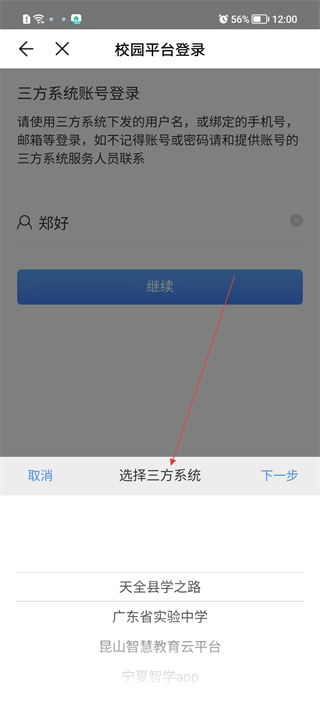 2、在校園平臺登錄界面輸入對應的賬號信息,點擊繼續按鈕,再選擇對應的第三方系統,確定后進入該系統的登錄頁面準備。