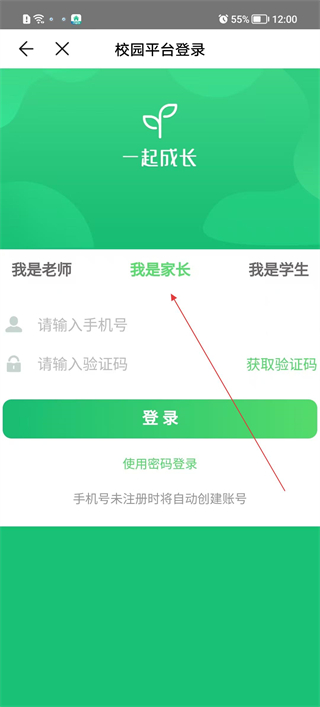 4、選擇家長身份后在對應的登錄界面輸入手機號碼,點擊獲取驗證碼,填入收到的驗證碼,之后點擊登錄按鈕,完成校園平臺的登錄。