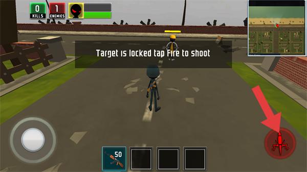 4、拾取武器后,界面提示【Target is locked tap Fire to shoot】,右側出現射擊按鈕,此時目標已鎖定,點擊射擊按鈕即可攻擊敵人,完成對戰操作積累擊殺數。