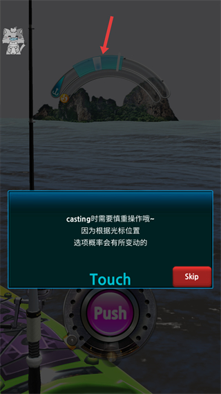 2、進入拋竿環節需關注光標位置,點擊Push按鈕完成拋竿,找準的位置影響后續釣魚的成功率。