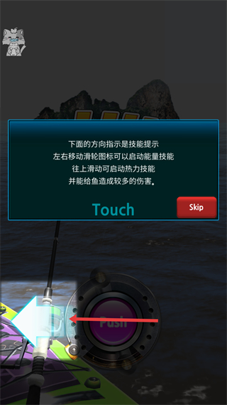 4、釣魚過程中可通過操作滑輪圖標釋放技能,左右移動滑輪可啟動能量技能,往上滑動可啟動熱力技能,這些技能能給魚造成較多傷害。