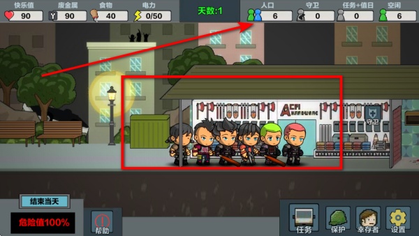 2、主界面會顯示當前的人口數量及各類資源數值,界面中能看到幸存者的集合區域,可根據需求調配這些幸存者參與不同事務。