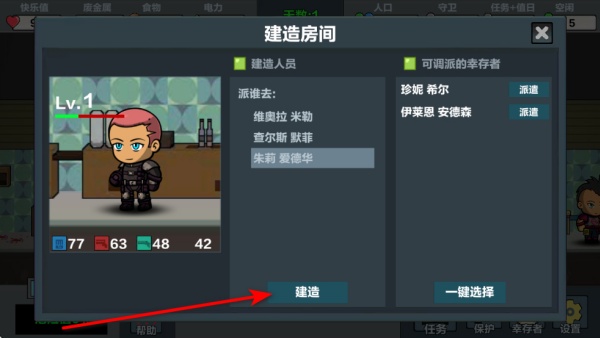 4、在建造房間界面可選擇派遣幸存者參與建造,選定人員后點擊建造按鈕即可推進房間建設,建成后能解鎖對應功能輔助生存。