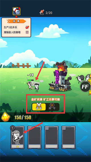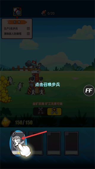 1、進入游戲后左上角顯示任務欄,找到下方步兵卡片并點擊,消耗對應資源召喚步兵,同時可查看金礦狀態,確保資源充足以支撐兵力生產。