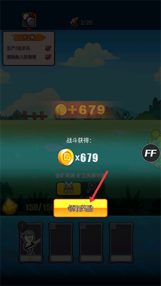 4、摧毀敵方基地戰斗即可結束,界面會顯示獲得的金幣獎勵,點擊領取獎勵按鈕即可獲取對應的資源,這些資源可提升作戰能力。