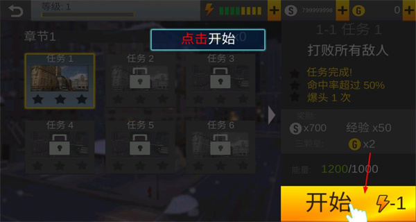 1、進入游戲后,查看章節任務列表,選擇已解鎖的任務1,點擊開始按鈕,即可進入對應關卡的戰斗界面。