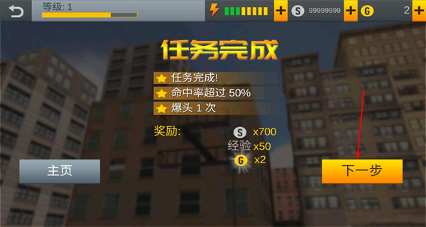 4、完成關卡任務后,進入任務完成頁面,查看獲得的獎勵,點擊下一步按鈕,即可進入下一個關卡的準備界面。