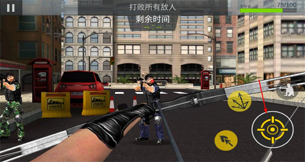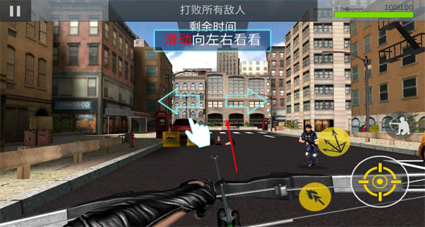 2、進入關卡戰斗界面,查看剩余時間,按提示滑動屏幕查看四周,操控角色移動,準備瞄準出現的敵人。