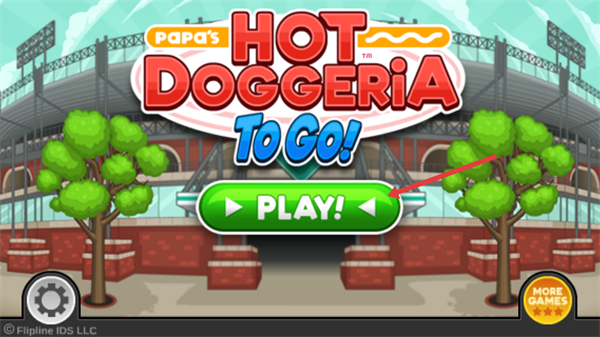 1、這是【Papas Hot Doggeria To Go】的啟動界面,點擊綠色的PLAY按鈕即可進入游戲,該作是經營類游戲,核心玩法為制作熱狗滿足顧客需求。