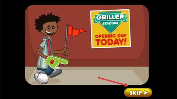4、進入劇情界面后,若想快速開始經營,可點擊右下角的SKIP按鈕跳過劇情,直接進入熱狗店的實際經營場景,開始處理顧客訂單。