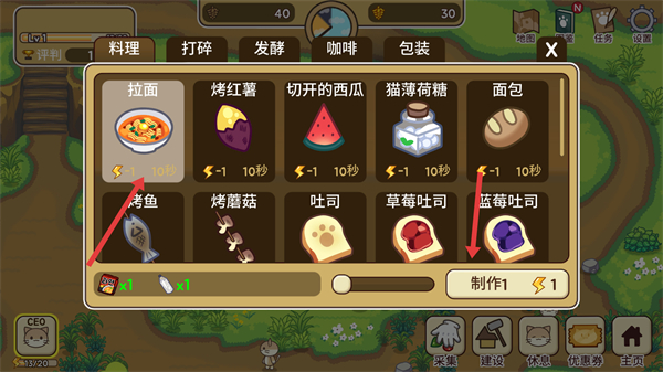 3、在料理制作界面中選中任務要求的料理選項,確認所需材料與制作時間,點擊制作按鈕開始料理的制作流程。