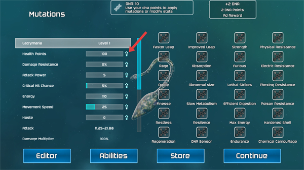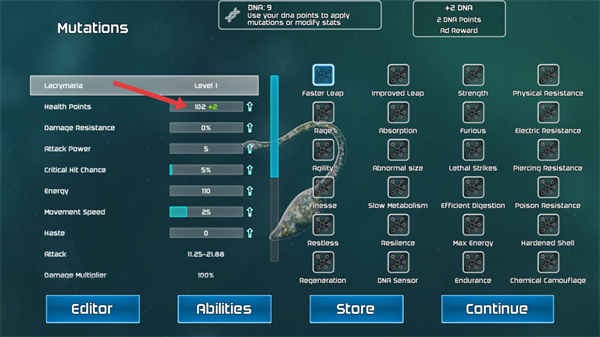 4、完成屬性調整后,生命值等屬性數值會同步更新,確認配置無誤后,點擊Continue按鈕即可保存變異設置,進入游戲游玩環節體驗強化后的生物能力。