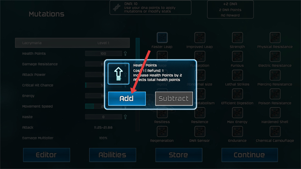 3、選擇Health Points相關變異時,點擊Add按鈕可提升生命值上限,每次添加會消耗對應DNA點數,提升后生物的生存能力會得到顯著增強。