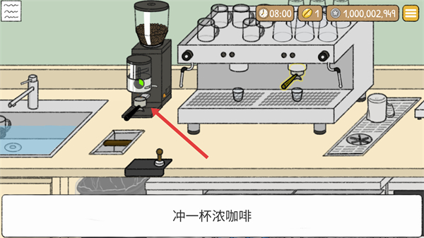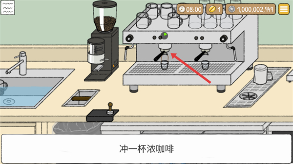 2、在操作場景中按照提示操作對應的咖啡設備,完成濃咖啡的沖泡步驟,推進飲品的制作進程。