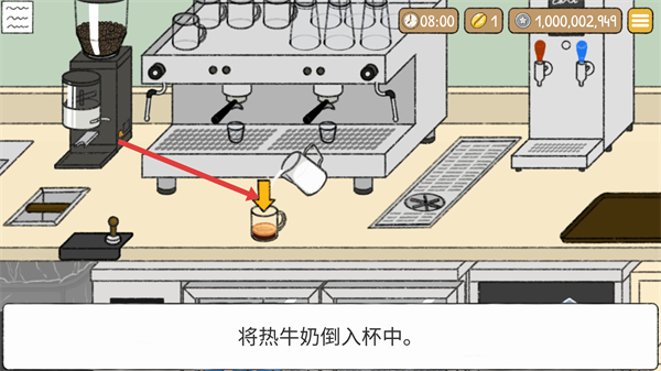 4、在后續步驟中按照提示將熱牛奶倒入對應的容器中,完成這一步的操作,逐步完成整個飲品的制作任務。