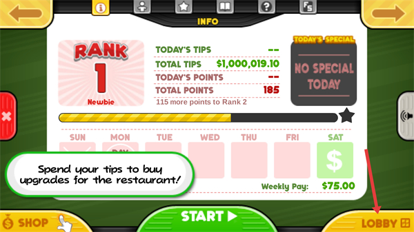 1、當前界面顯示餐廳排名為1級,可使用小費升級餐廳,點擊LOBBY按鈕,來改善餐廳。
