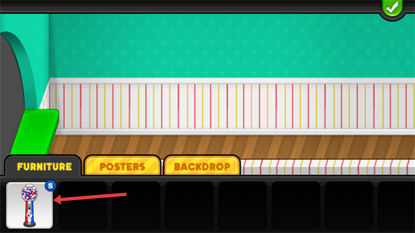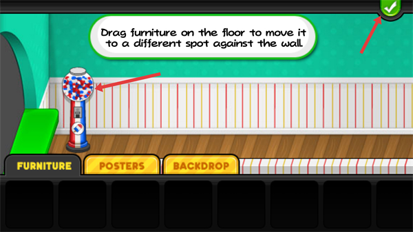 2、進入裝飾界面后,FURNITURE分類下可選糖果機等設施,點擊對應家具圖標,即可將其布置到餐廳場景中,裝飾餐廳以提升顧客體驗。