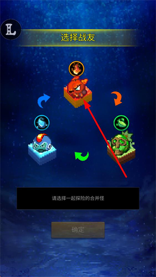1、進入選擇戰友界面,可挑選不同屬性的合并怪如火屬性、水屬性、植物屬性,選定要一起探險的合并怪后,點擊確定按鈕進入關卡。