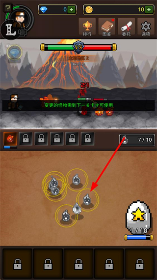 3、進入火爐地區2關卡,界面提示變更的怪物需到下一關才使用,可對下方的怪物單位進行合并操作,以此提升怪物的等級或品質。
