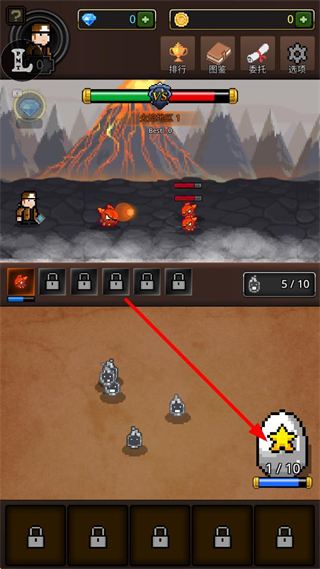 2、進入火爐地區1關卡,界面展示對戰進度、鉆石、金幣等資源,下方區域分布怪物單位,右側可查看道具如帶星標識的蛋,推進關卡開展戰斗。