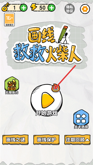 1、進入游戲界面后,可看到【開始游戲】按鈕,點擊即可進入關卡,界面還有【無限體力】與【關卡選擇】功能。