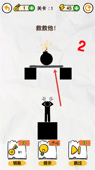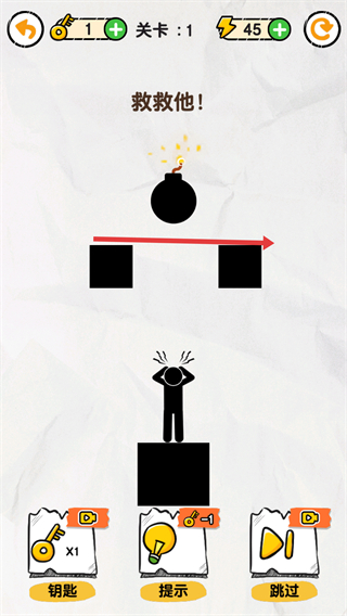 2、關卡內會出現帶有引線的炸彈,需通過畫線操作保護火柴人,觀察場景中平臺布局,按提示方向繪制線條,可阻擋危險,同時可使用鑰匙、提示等輔助道具。