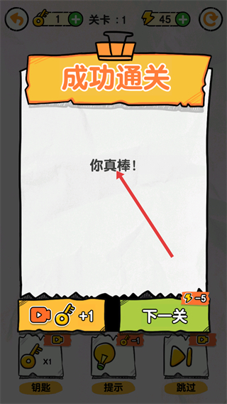 4、成功通關后會顯示【你真棒】的提示,可點擊【下一關】繼續挑戰,同時能獲得鑰匙獎勵,積累道具可助力后續更復雜關卡的通關。