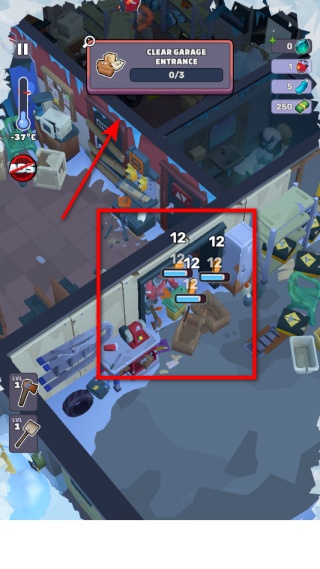 1、進入場景后先獲取工具,點擊對應的工具圖標,將其拾取到下方欄位,用這些工具清理周邊的物品,完成目標進度來推進流程。