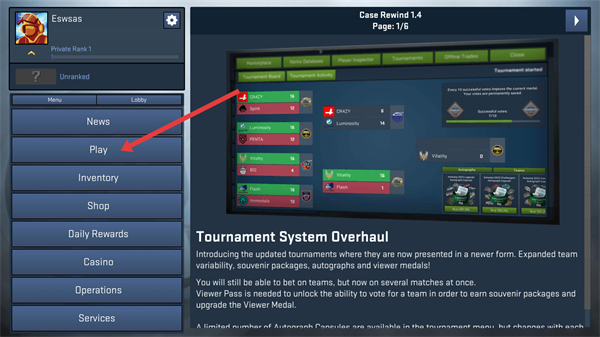 1、進入界面后,點擊【Play】選項可進入游戲模式選擇頁,同時左側菜單包含新聞、庫存、商店等功能。