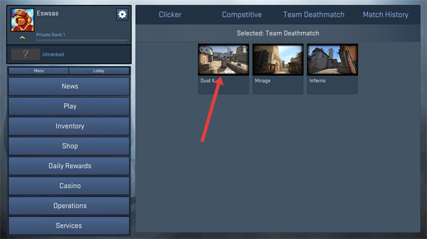 2、進入游戲模式選擇頁后,可切換至【Team Deathmatch】模式,選擇地圖如【Dust】,這類地圖是經典競技場景,適合快速熟悉團隊對戰的節奏與地形。